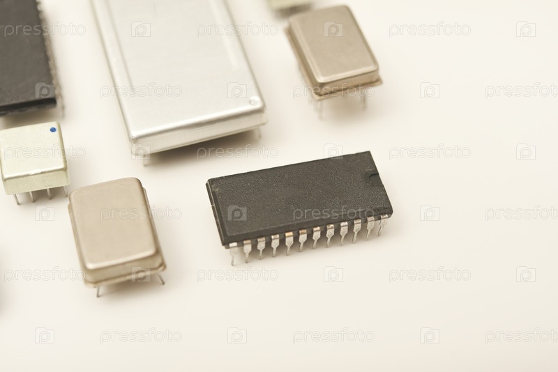 Старые чипсы на белом фоне. Электронные компоненты. Процессоры в металлических и пластиковых корпусах