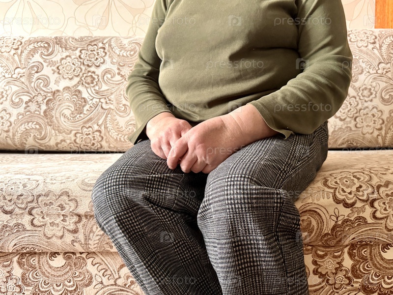 Крупный план руки пенсионерки, которая сидит на диване дома