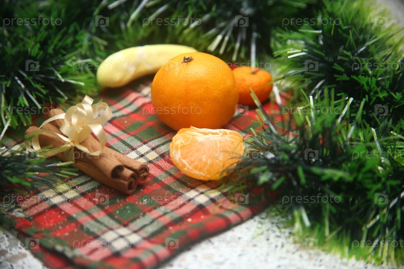 Фрукты сочные мандарины и корица лежат на столе
