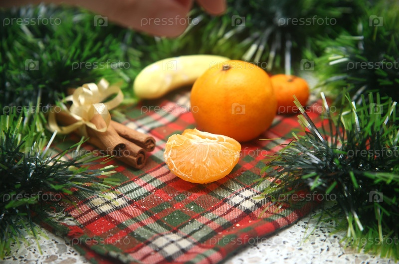 Фрукты сочные мандарины и корица на столе