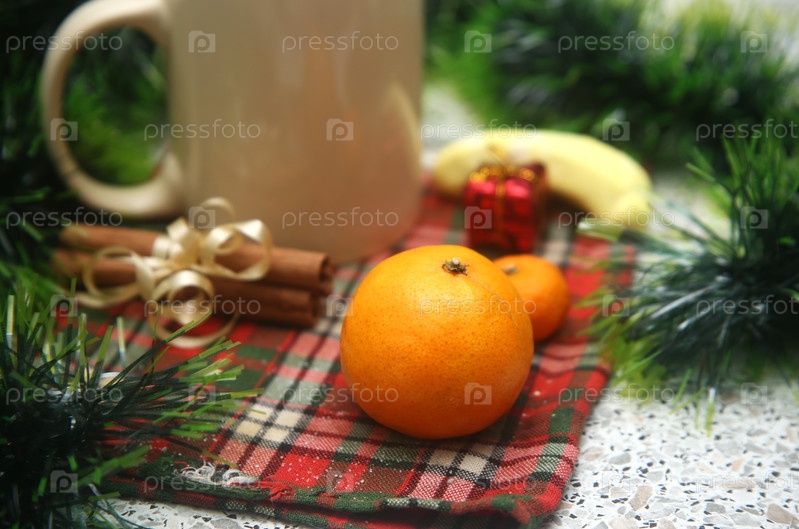 Фрукты сочные мандарины и корица на столе