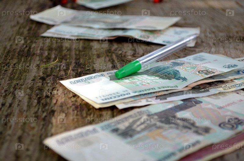 Разбросанные бумажные деньги на деревянной поверхности и авторучка