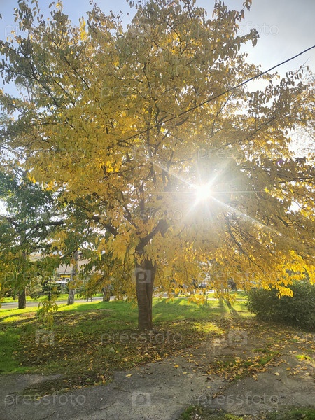 Солнечное осеннее дерево с золотыми листьями и солнечными вспышками в городском парке, обои природы