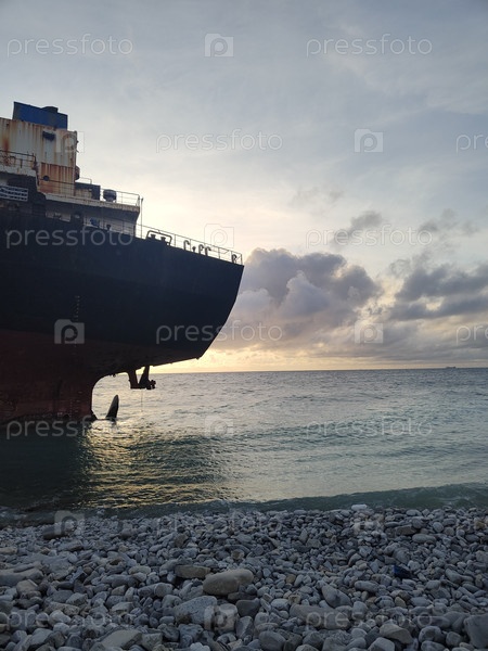 Старое судно у берега, ржавое судно, морской и скалистый пляж, фон, обои