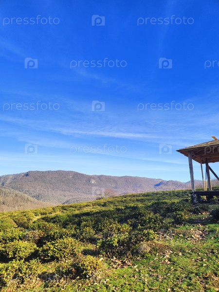 Горный пейзаж с чайными кустами и беседкой, голубое небо, естественный фон, обои