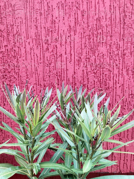 Зеленые листья на фоне красной стены, растительный фон, текстура, обои