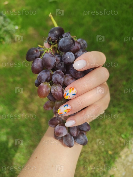 Куча винограда в руке с ярким маникюром, свежим фоном, летними обоями