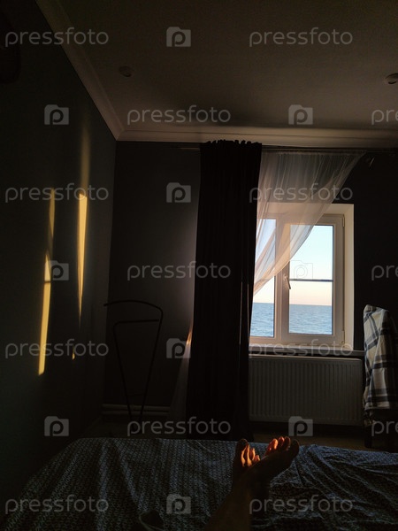 Вид на море из темной комнаты, вечерний свет на кровати, уютный интерьер, фон, обои