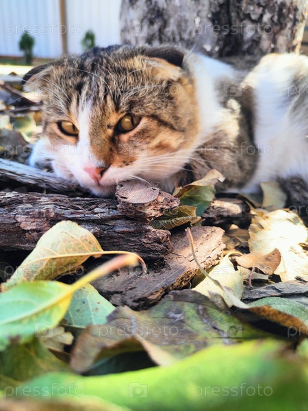 Кошка, лежащая среди осенних листьев и коры, питомец, естественный фон, обои