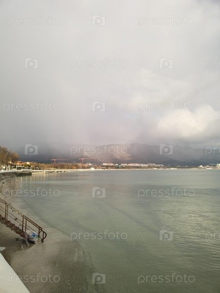 Спокойное побережье, горы в тумане, облачное небо, естественный фон, обои