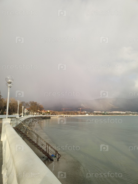 Спокойное побережье, горы в тумане, облачное небо, естественный фон, обои