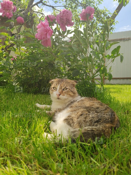 Кошка на зеленой траве и розовых пионах, летний сад, естественный фон, обои