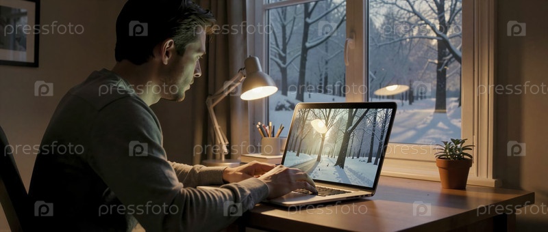 Зимняя работа из домашней сцены с человеком, пишущим на ноутбуке