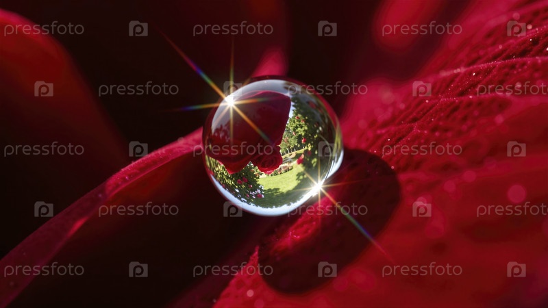 Отражающая кристаллическая водяная капля на красном листе