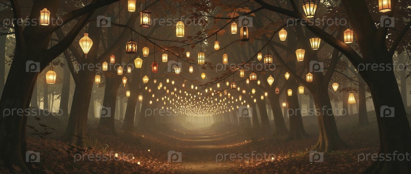 Одно краткое предложение (5-10 слов): 'Зачарованная лесная дорожка с фонарями