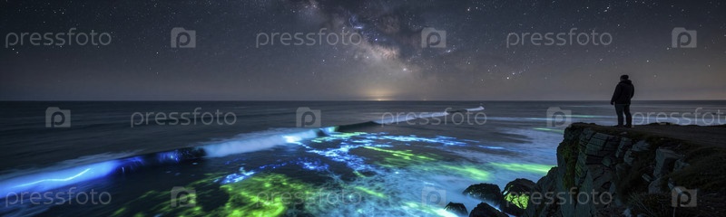 Звездная прибрежная ночь с биолюминесцентными волнами и звездочетом