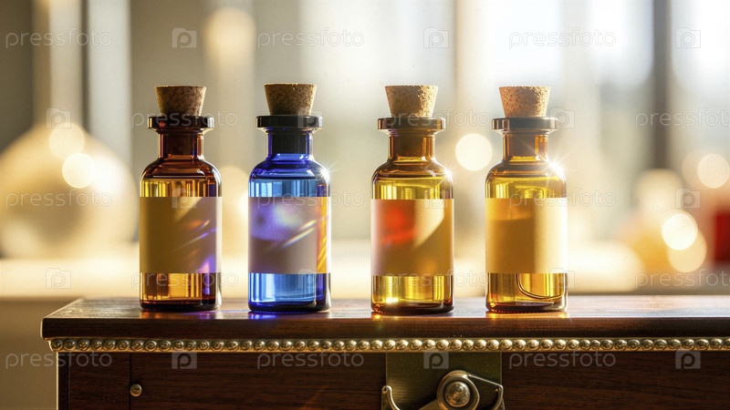 Четыре винтажные стеклянные бутылки с пробками на дереве