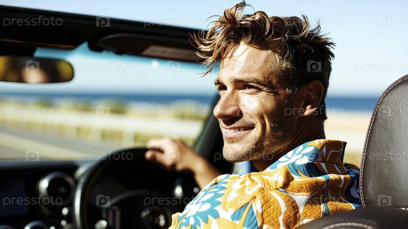 Улыбающийся мужчина за рулем кабриолета с пляжным фоном