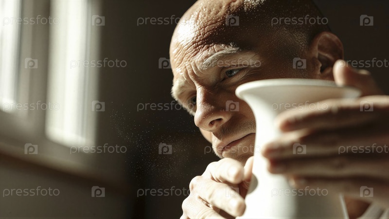Мужчина с лысой головой осматривает белую фарфоровую чашку