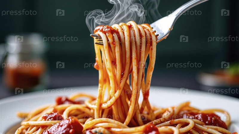 Горячие спагетти с томатным соусом на вилке
