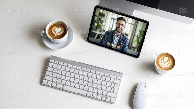 Человек в виртуальной встрече с кофе и клавиатурой