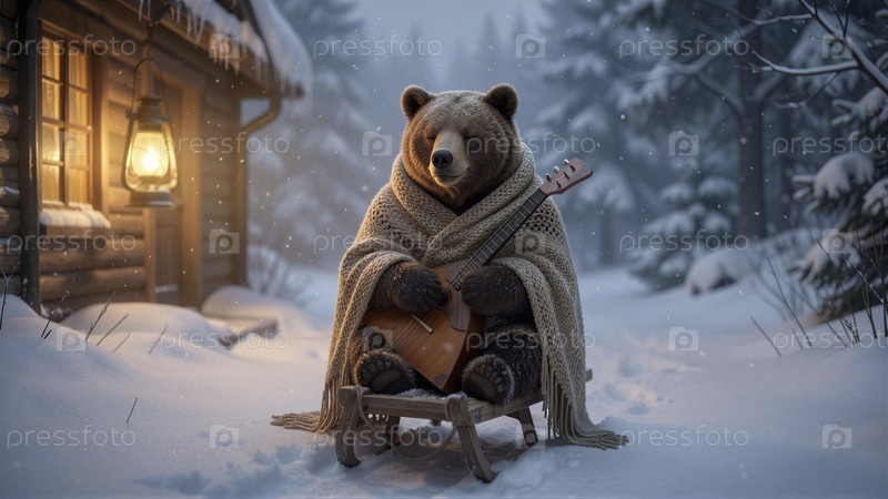 Уютный медведь играет на гитаре вне дома