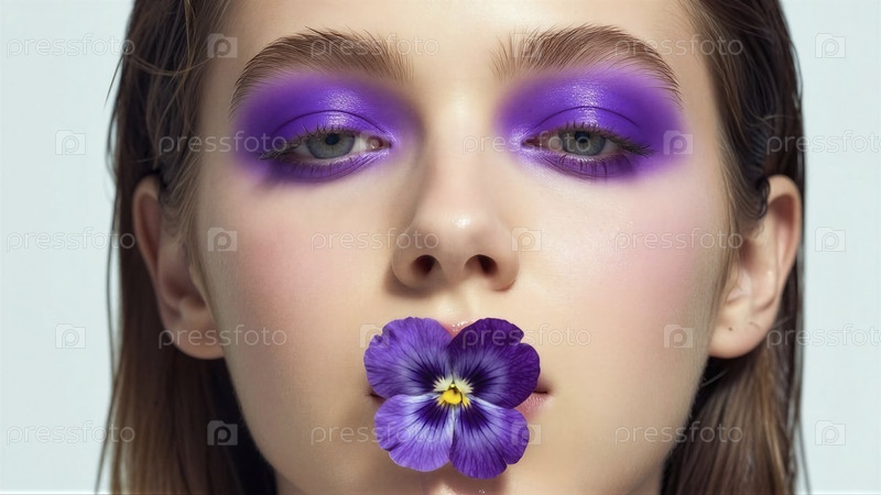 Женщина с фиолетовым макияжем держит фиолетовый цветок
