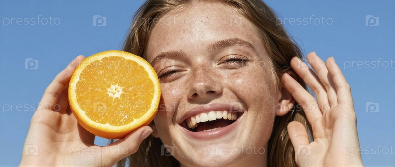 Улыбающаяся девушка держит оранжевый кусочек на лице