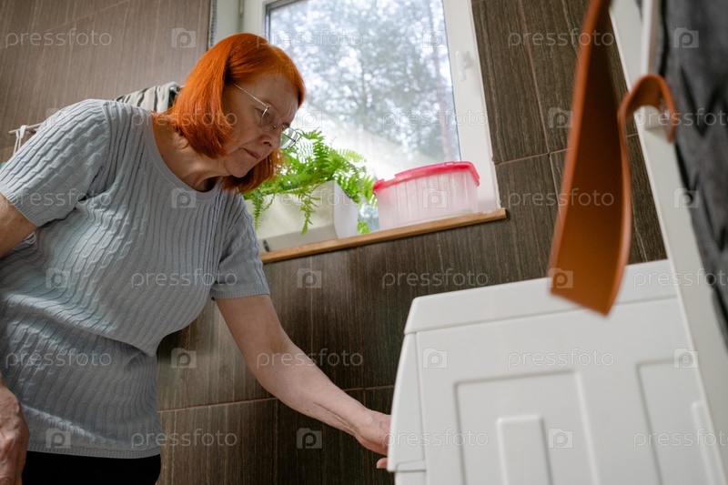 Зрелая женщина начинает прачечный цикл с низким углом выстрела