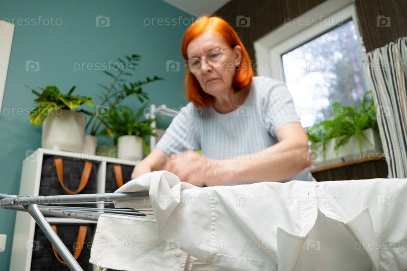 Зрелая дама тщательно размещает рубашку на стойке, чтобы избежать любых складок