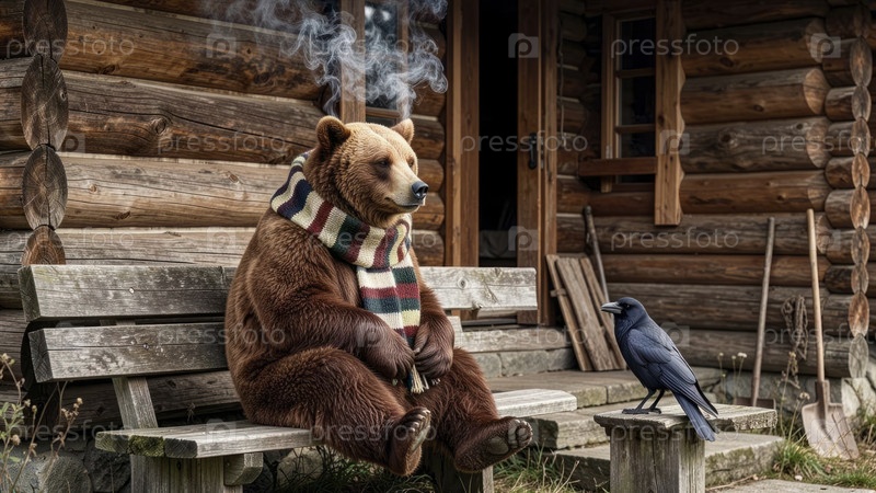 Медведь в шарфе расслабляется вне бревенчатой хижины