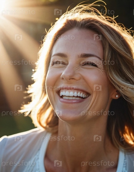 Портрет смеющейся кавказской красавицы коричневатой женщины средних лет с прямыми текучими взъерошенными волосами и белыми зубами. Солнечная погода. Радость счастья. Положительные эмоции. Скандинавский тип лица. ИИ