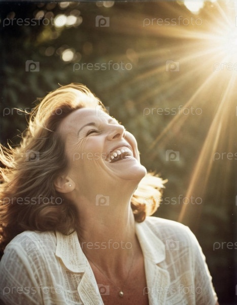 Портрет смеющейся кавказской красавицы коричневатой женщины средних лет с прямыми текучими взъерошенными волосами и белыми зубами. Солнечная погода. Радость счастья. Положительные эмоции. Скандинавский тип лица. ИИ