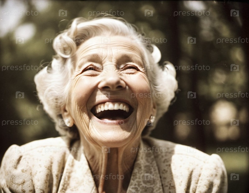 Пожилая кавказка с белыми волосами, широко улыбается. Она смотрит вверх. Старушка со скандинавским типом лица. Серые волосы, белые зубы. Веселый активный жизнерадостный пенсионер. Генерированный ИИ