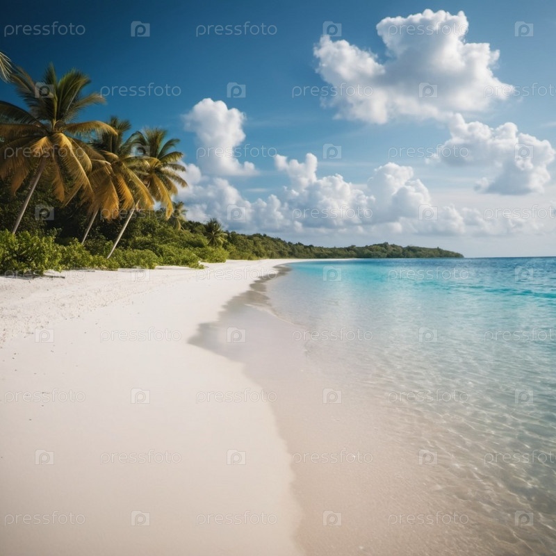 Захватывающий вид на нетронутый пляж с белым песком на Мальдивах. Бирюзовые воды Индийского океана плавно прилегают к берегу, создавая безмятежную идиллическую сцену. Небо ярко-голубое, усеянное пушистыми белыми облаками