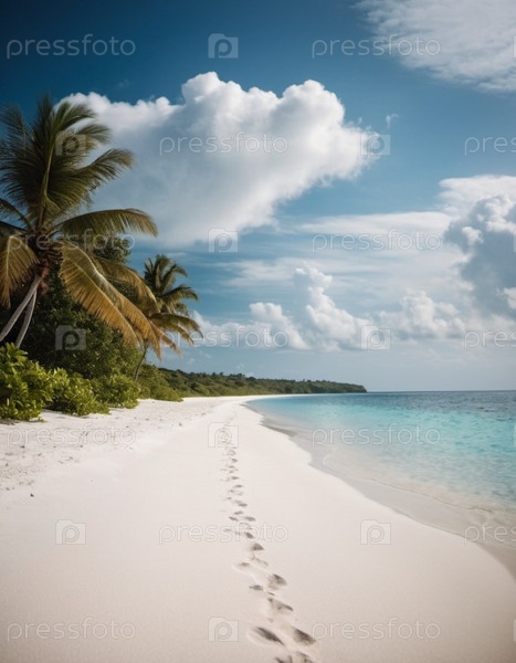 Захватывающий вид на нетронутый пляж с белым песком на Мальдивах. Бирюзовые воды Индийского океана плавно прилегают к берегу, создавая безмятежную идиллическую сцену. Небо ярко-голубое, усеянное пушистыми белыми облаками