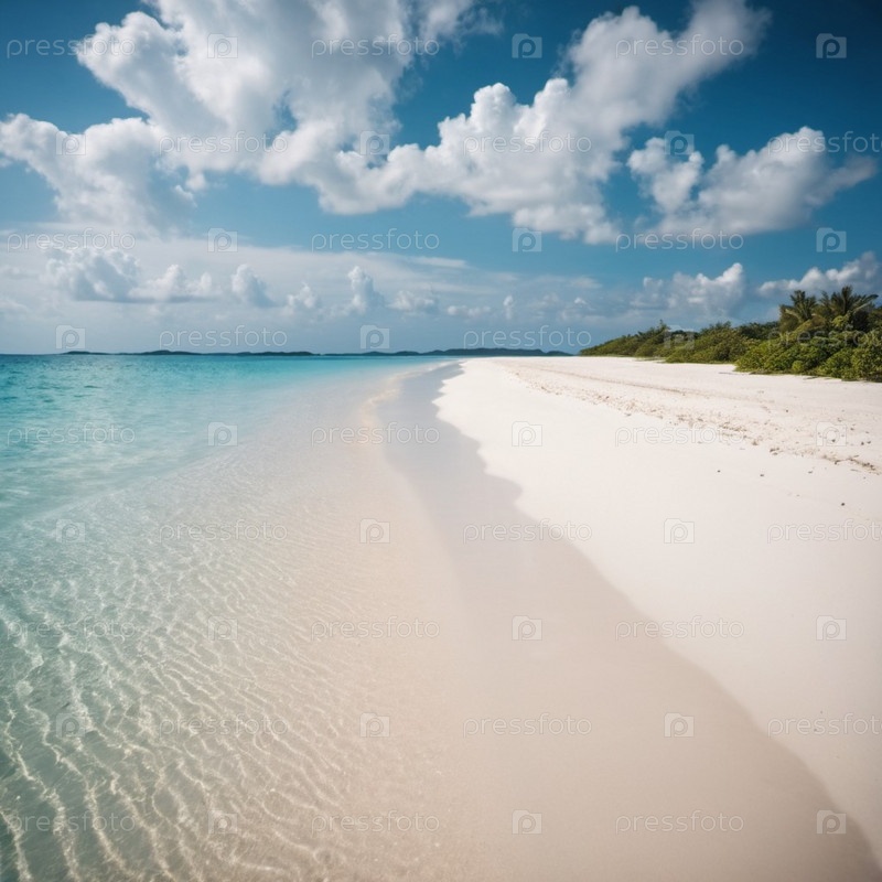 Захватывающий вид на нетронутый пляж с белым песком на Мальдивах. Бирюзовые воды Индийского океана плавно прилегают к берегу, создавая безмятежную идиллическую сцену. Небо ярко-голубое, усеянное пушистыми белыми облаками