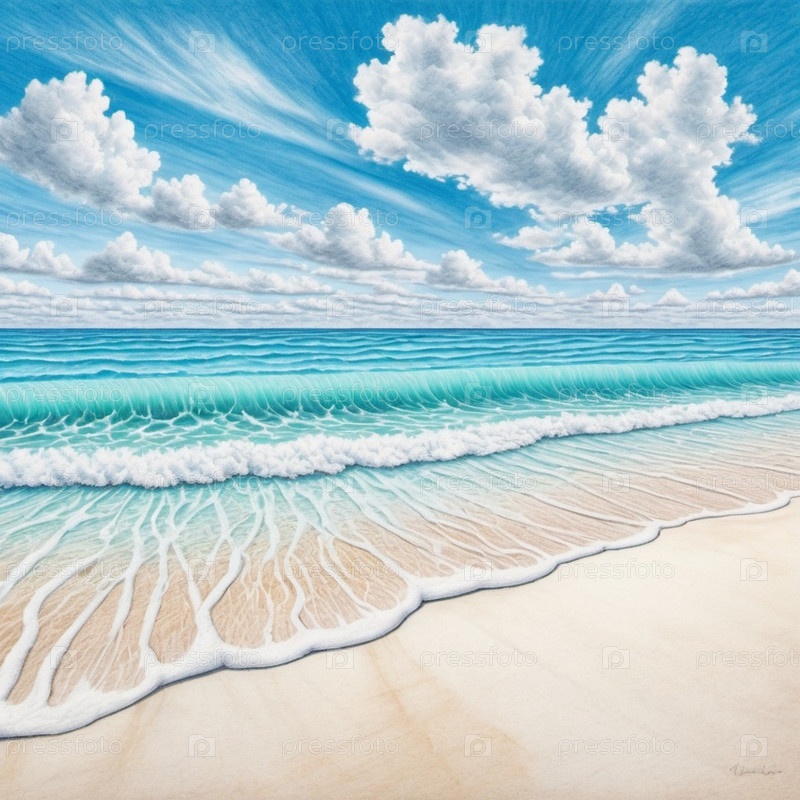 Захватывающий вид на нетронутый пляж с белым песком на Мальдивах. Бирюзовые воды Индийского океана плавно прилегают к берегу, создавая безмятежную идиллическую сцену. Небо ярко-голубое, усеянное пушистыми белыми облаками