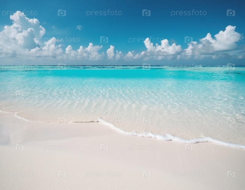 Захватывающий вид на нетронутый пляж с белым песком на Мальдивах. Бирюзовые воды Индийского океана плавно прилегают к берегу, создавая безмятежную идиллическую сцену. Небо ярко-голубое, усеянное пушистыми белыми облаками