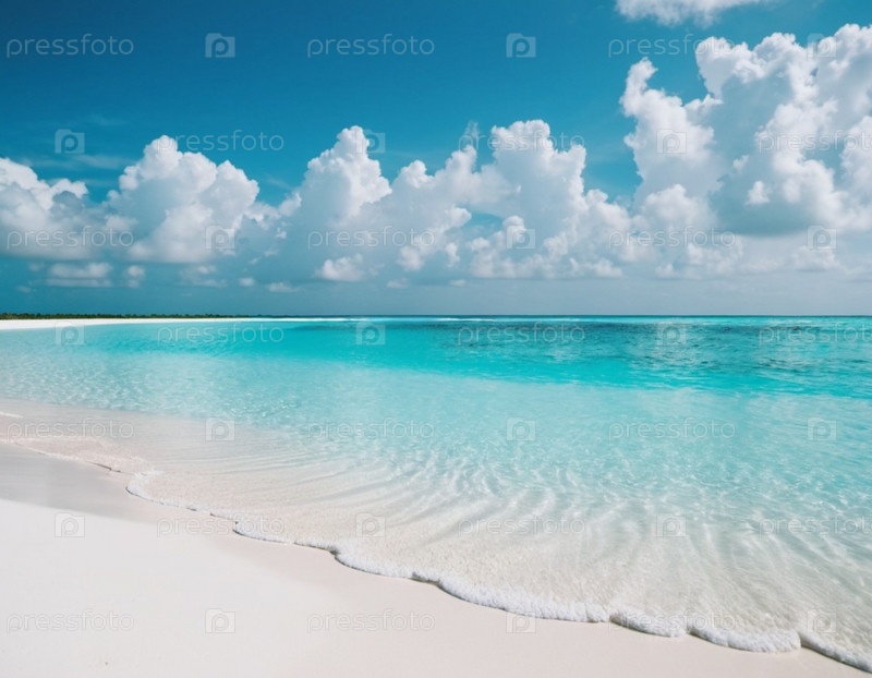 Захватывающий вид на нетронутый пляж с белым песком на Мальдивах. Бирюзовые воды Индийского океана плавно прилегают к берегу, создавая безмятежную идиллическую сцену. Небо ярко-голубое, усеянное пушистыми белыми облаками