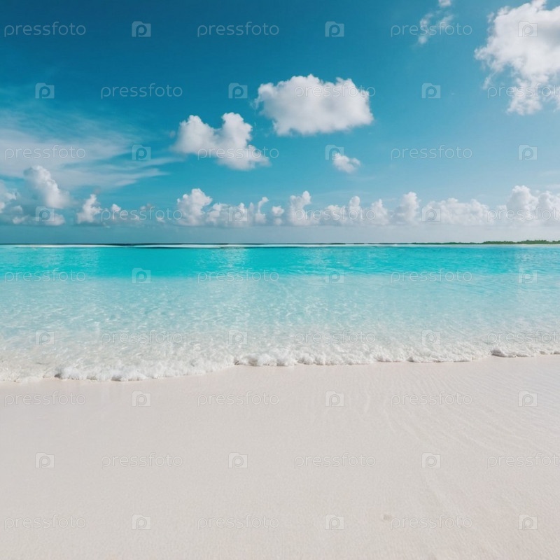 Захватывающий вид на нетронутый пляж с белым песком на Мальдивах. Бирюзовые воды Индийского океана плавно прилегают к берегу, создавая безмятежную идиллическую сцену. Небо ярко-голубое, усеянное пушистыми белыми облаками