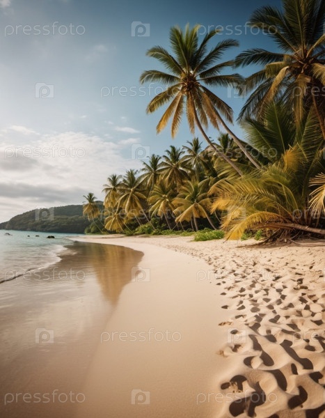 Серена пляжная сцена с нежными волнами, песчаной береговой линией и пальмами, отбрасывающими тени. Яркие цвета и мягкие мазки создают спокойную атмосферу. Генерированный ИИ. Солнечные пляжные каникулы