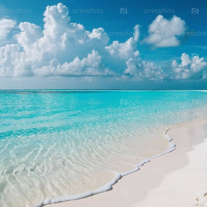 Захватывающий вид на нетронутый пляж с белым песком на Мальдивах. Бирюзовые воды Индийского океана плавно прилегают к берегу, создавая безмятежную идиллическую сцену. Небо ярко-голубое, усеянное пушистыми белыми облаками