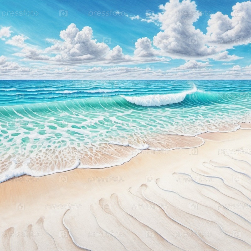 Захватывающий вид на нетронутый пляж с белым песком на Мальдивах. Бирюзовые воды Индийского океана плавно прилегают к берегу, создавая безмятежную идиллическую сцену. Небо ярко-голубое, усеянное пушистыми белыми облаками