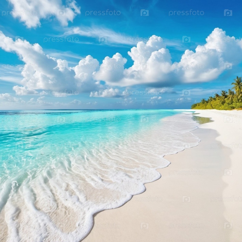 Захватывающий вид на нетронутый пляж с белым песком на Мальдивах. Бирюзовые воды Индийского океана плавно прилегают к берегу, создавая безмятежную идиллическую сцену. Небо ярко-голубое, усеянное пушистыми белыми облаками