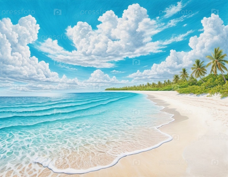 Захватывающий вид на нетронутый пляж с белым песком на Мальдивах. Бирюзовые воды Индийского океана плавно прилегают к берегу, создавая безмятежную идиллическую сцену. Небо ярко-голубое, усеянное пушистыми белыми облаками