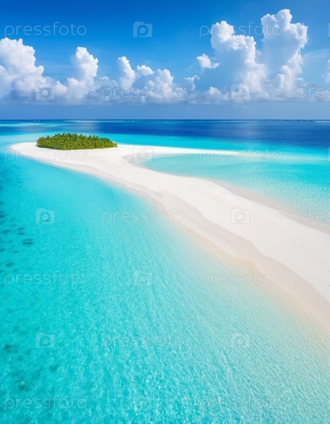 Захватывающий вид на нетронутый пляж с белым песком на Мальдивах. Бирюзовые воды Индийского океана плавно прилегают к берегу, создавая безмятежную идиллическую сцену. Небо ярко-голубое, усеянное пушистыми белыми облаками