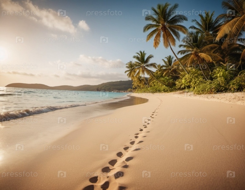 Серена пляжная сцена с нежными волнами, песчаной береговой линией и пальмами, отбрасывающими тени. Яркие цвета и мягкие мазки создают спокойную атмосферу. Генерированный ИИ. Солнечные пляжные каникулы