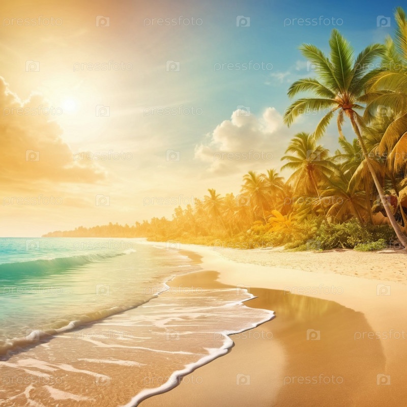 Серена пляжная сцена с нежными волнами, песчаной береговой линией и пальмами, отбрасывающими тени. Яркие цвета и мягкие мазки создают спокойную атмосферу. Генерированный ИИ. Солнечные пляжные каникулы