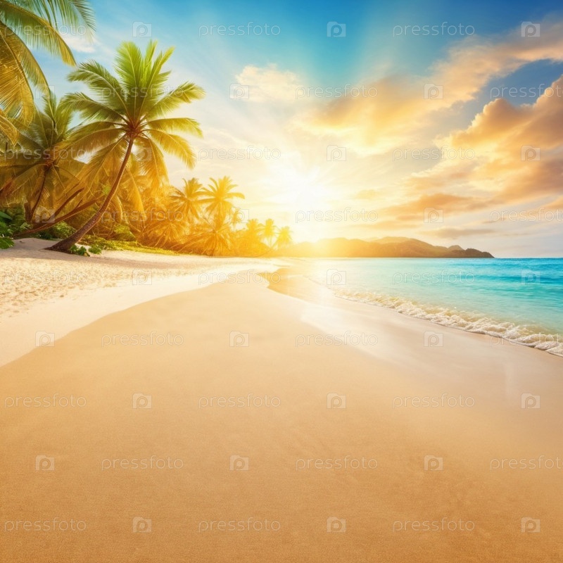Серена пляжная сцена с нежными волнами, песчаной береговой линией и пальмами, отбрасывающими тени. Яркие цвета и мягкие мазки создают спокойную атмосферу. Генерированный ИИ. Солнечные пляжные каникулы